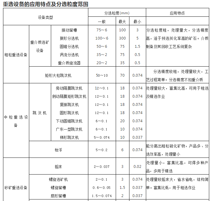 下表列出了各類重選設備的應用特點及分選粒度范圍,供選型時參考。